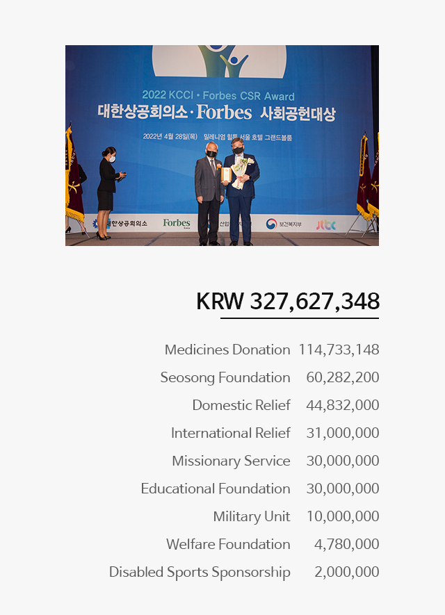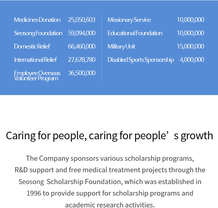 The company sponsors various scholarship programs, R&D support and free medical treatment projects